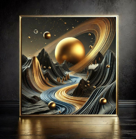 Eine fantastische Landschaft in deren Mittelpunkt ein goldener Planet mit einem Ring, der an den Saturn erinnert, steht. Die Landschaft besteht aus geschwungenen, dunklen und goldenen Formationen, die an Berge und Flüsse erinnern. Kleine goldene Kugeln sind über das Bild verstreut, und es gibt einen Sternenhintergrund. Das Gesamtbild ist surreal und kunstvoll