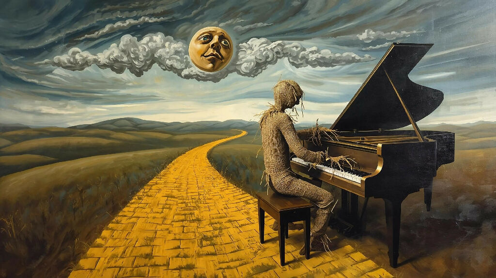Surreal tribute to the Elton John classic Goodbye Yellow Brick Road with a scarecrow playing the piano and a solemn sun in the sky.