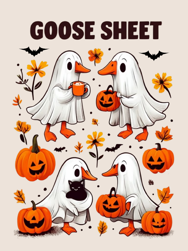 Get ready for the spooky season with our funny "Goose Sheet" ghost ducks digital design! This high-resolution PNG file features a whimsical trio of cartoon ghosts (ducks or geese) having a fun Halloween day. One ghost goose is relaxing with a cup of coffee, another is holding a black cat, and the third is posed with a carved pumpkin. The scene is complete with bats, spiders, and falling autumn leaves.