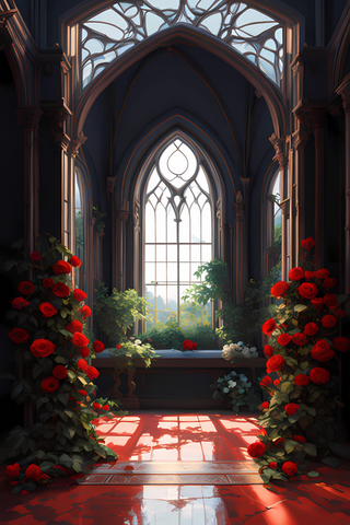 Dark academia, gothic style window with windowsill, gothic arches, red roses and overgrown plants, romantic.