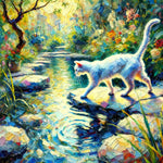 "Graceful Crossing" is an expressionist painting that vividly captures the elegance and delicacy of a cat as it carefully walks across the rocks in a pond to reach the other side of a garden. The vibrant colors and dynamic brushstrokes bring the scene to life, highlighting the serene beauty of the garden and the cat's poised movement. The painting evokes a sense of tranquility and harmony with nature, celebrating the cat's graceful journey.