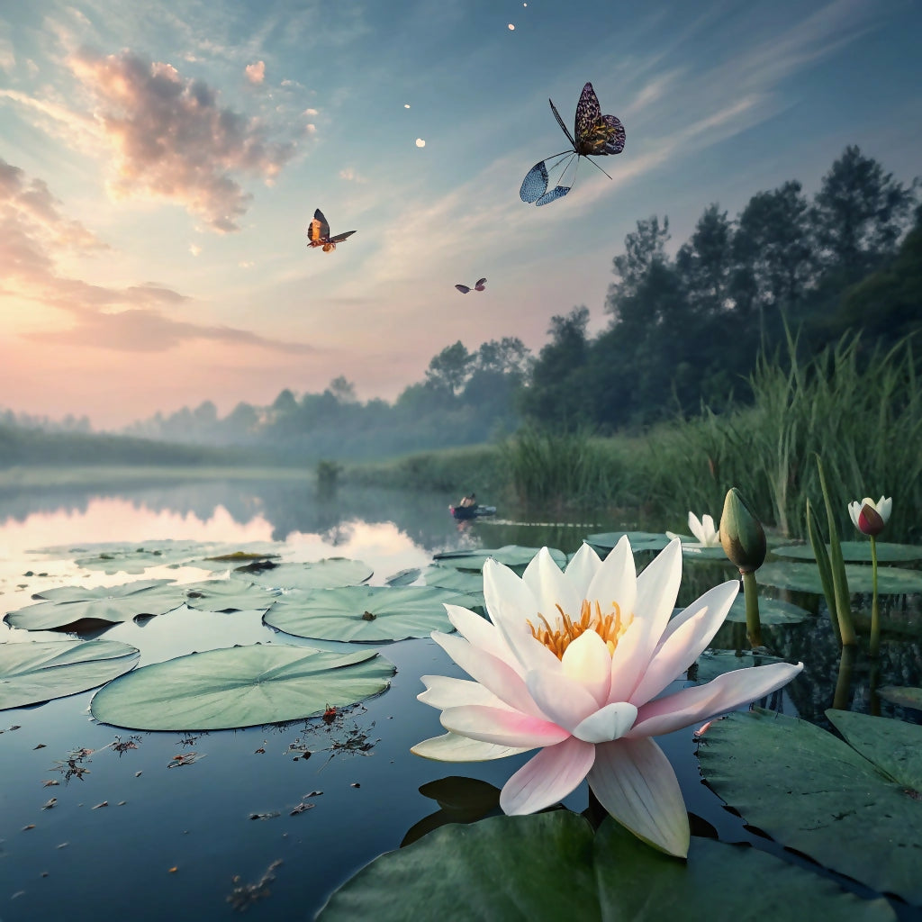 The image features a water lily elegantly positioned on the surface of a serene pond. Above it, butterflies hover gracefully, adding to the tranquil atmosphere. The scene captures the beauty of nature with its vibrant colours and peaceful reflections in the water. The surrounding landscape includes a clear sky and wispy clouds, enhancing the overall outdoor experience.