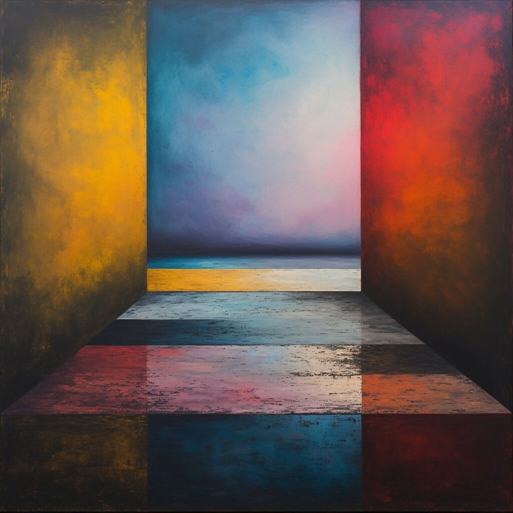On the left, a richly textured yellow panel recedes into the distance, its surface hinting at tactile qualities. Mirroring this, a deep, resonant red panel frames the right side, also drawing the eye inward.