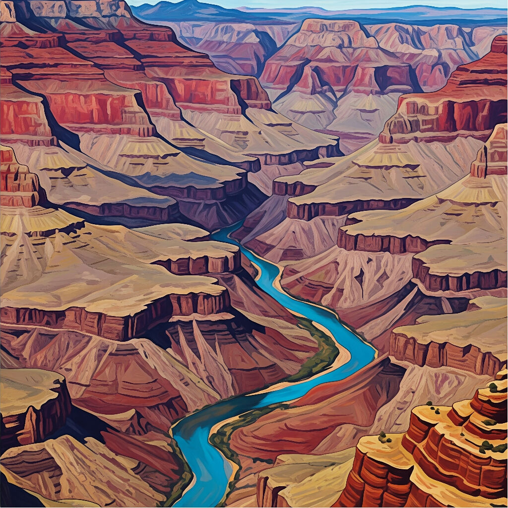 This vibrant, stylized aerial view depicts the majestic Grand Canyon. A striking turquoise-blue river, likely the Colorado River, snakes its way through the deep chasm, creating a dramatic contrast with the warm earthy tones of the canyon walls. The numerous layers and geological formations of the canyon are rendered with clear definition, showcasing the immense scale and intricate natural artistry of the landscape. The color palette emphasizes the reds, oranges, and browns of the rock, interspersed with areas of lighter beige and shadows that define the canyon's contours. The overall impression is one of awe-inspiring natural grandeur, presented with an artistic flair that highlights the visual impact of this iconic landmark.