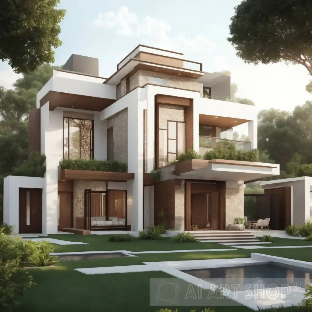 A large white house with a stone facade and wood accents is shown from an aerial view. The house features a garden, pool, and balcony on the second floor. There are multiple chairs placed around the area, some near the pool and others by the balcony. Two potted plants can be seen in front of the house, adding to the overall landscaping.