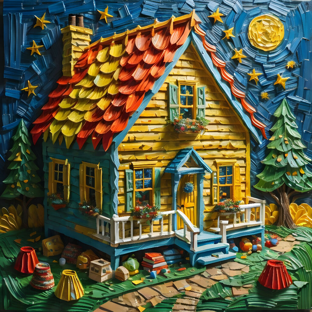 this is a painting done in 'palette knife' style. a quaint little house that belongs to grandma. smell her fresh baked cookies. sweet memories of dear old grandma.