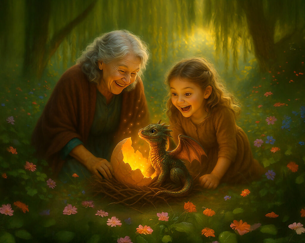 A heartwarming fantasy scene of a grandmother and child discovering a glowing baby dragon hatching from an egg in an enchanted forest.