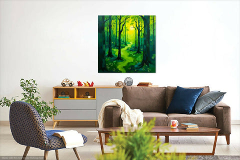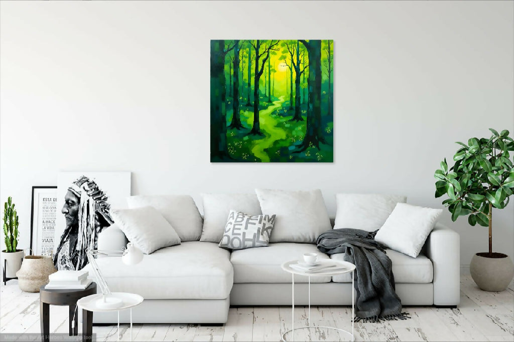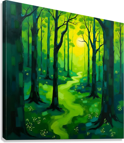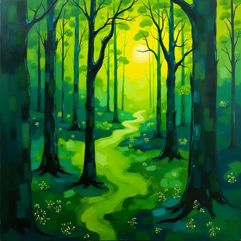 This image is a dynamic oil painting of a green forest, characterized by bold shapes and a textured, expressive aesthetic reminiscent of Cubist art.
