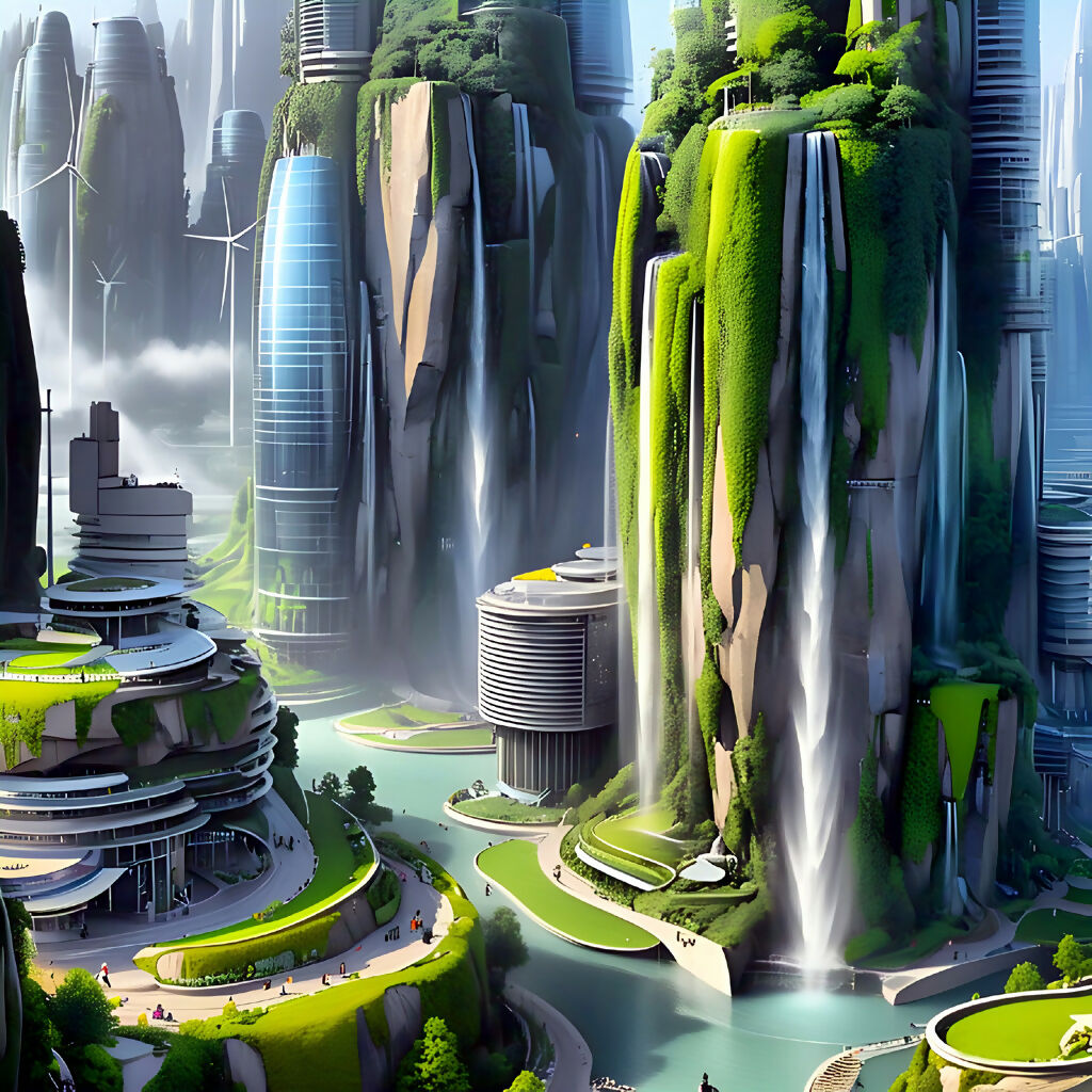 Step into a visionary world where advanced architecture coexists with untamed nature. This AI-generated artwork showcases a breathtaking futuristic cityscape, where sleek skyscrapers are draped in vertical gardens and waterfalls cascade from rooftop terraces. Wind turbines, vibrant greenery, and seamless Eco-designs highlight an urban utopia powered by sustainability and innovation. With intricate details and vivid colors, this piece captures a balanced harmony between technology and the environment—offering a hopeful glimpse into what future cities could become.