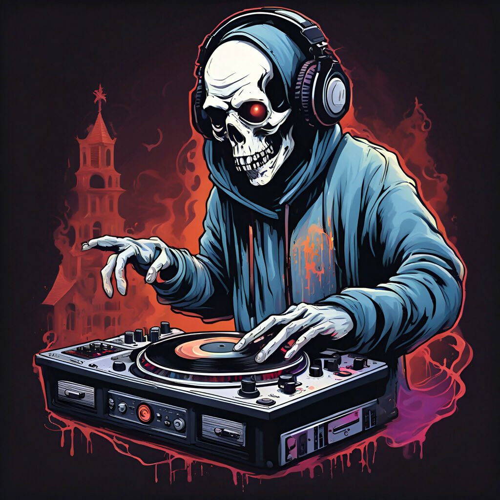 Elevate your space with the electrifying Grim Reaper DJ Hoodie Art Print. This captivating artwork showcases a skeletal DJ in a blue hoodie, spinning vinyl records on a turntable, with fiery red and orange hues illuminating the background. The intricate details and vibrant colors make this piece a perfect addition for music lovers, DJs, and fans of unique, edgy art. Printed on high-quality materials, this art print is designed to last and make a bold statement in any room.