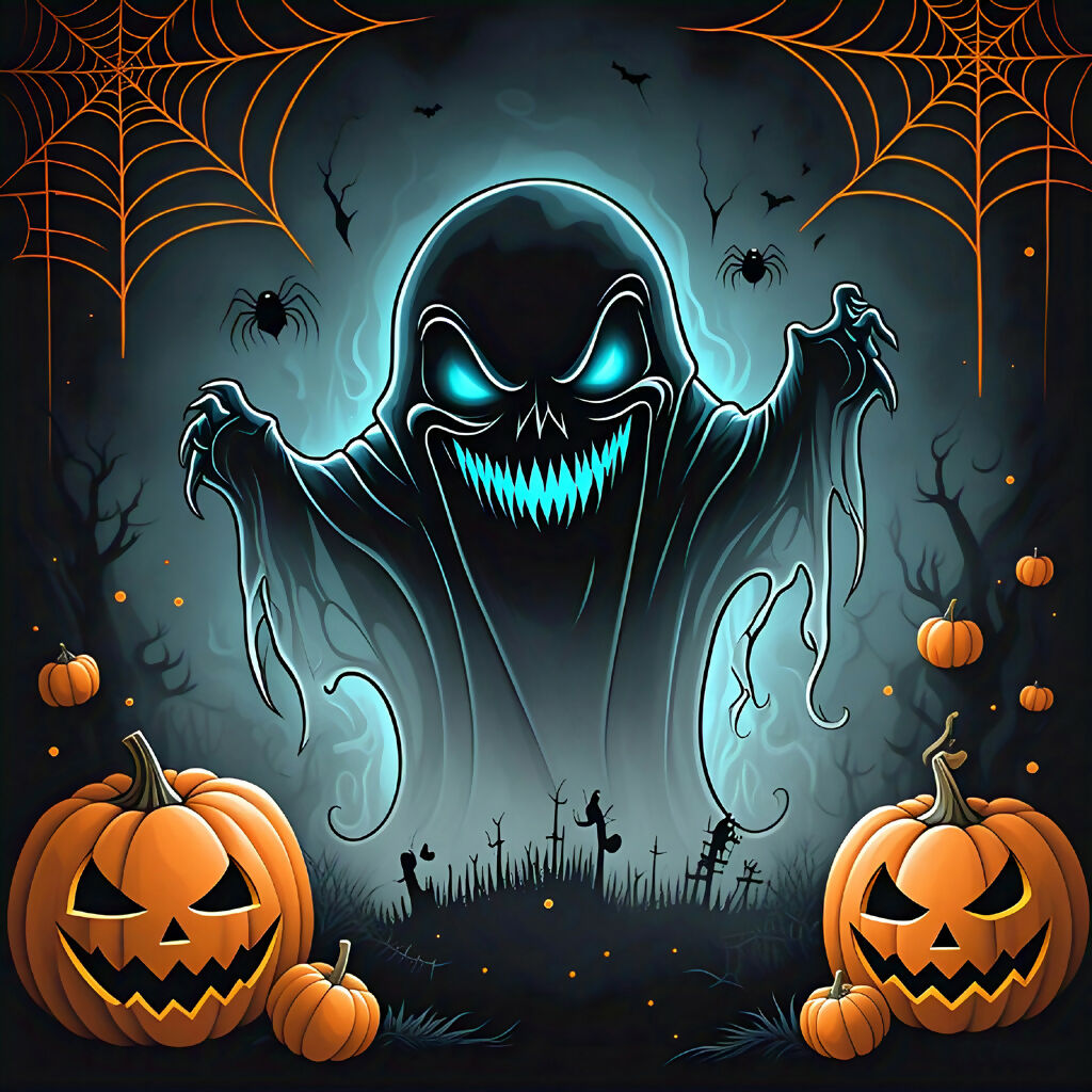 Step into the misty realm of the forgotten with Grin of the Grave, a surreal Halloween-themed AI illustration that captures the chilling moment a ghostly figure rises from the shadows of a haunted graveyard. With glowing blue eyes and a sinister grin, this spectral entity drifts among leafless trees and carved pumpkins, watched by bats and spiders that cling to orange webs overhead.