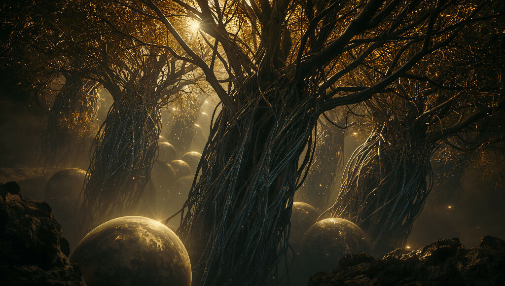 Massive trees with gnarled, serpentine trunks anchor an otherworldly forest where golden light filters through dense canopies. Planetary spheres rest among roots like fallen fruit from cosmic branches, blurring distinctions between terrestrial and astral. The trees become axis mundi, world pillars connecting earth and heaven. Their twisted forms suggest ancient wisdom and patient endurance, while the suspended planets imply that these guardians have witnessed celestial cycles beyond human reckoning. Atmosphere thick with luminous particles creates sanctified space where natural and supernatural coexist.