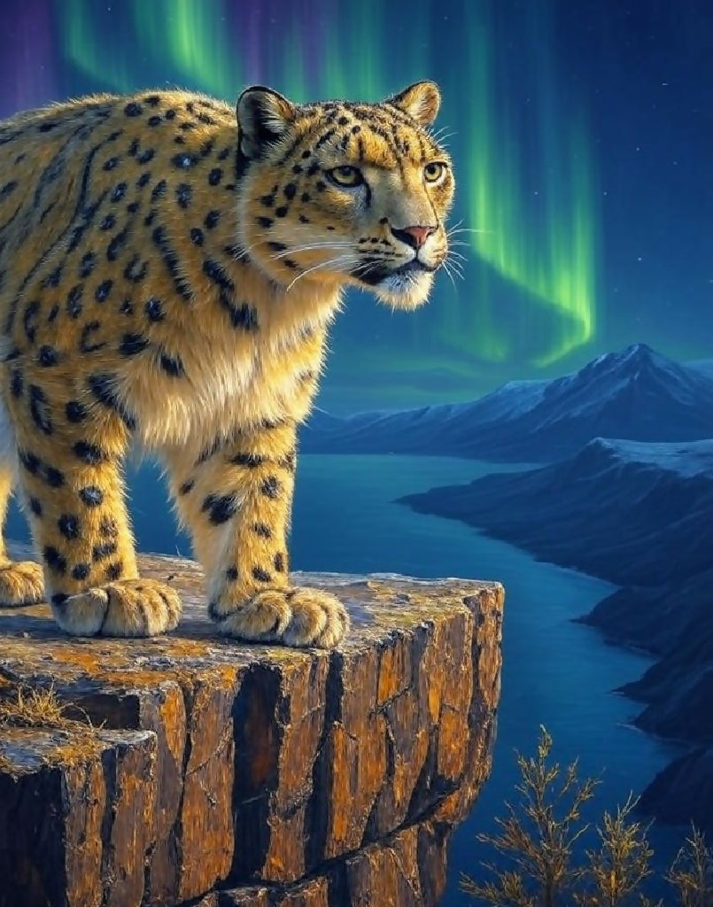 "A rare golden snow leopard stands majestically on a cliff edge, its fur shimmering with golden and silver hues under the enchanting northern lights. Painted with expressive oil brushstrokes and deep texture, this artwork blends realism and abstract expressionism, capturing the wild beauty of nature in cinematic 8K detail."