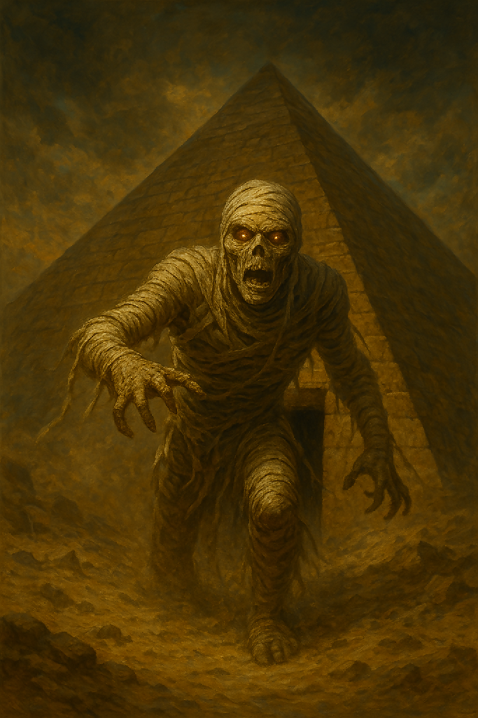 A haunting artwork capturing the moment an ancient guardian rises from the pyramid, with glowing eyes and an eerie presence—perfect for dark fantasy and mythology lovers.