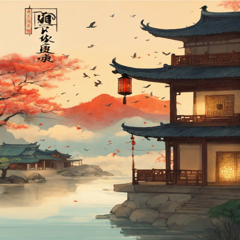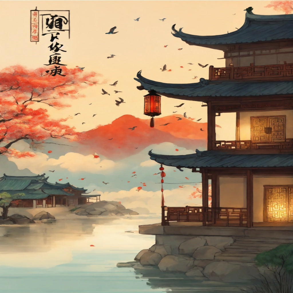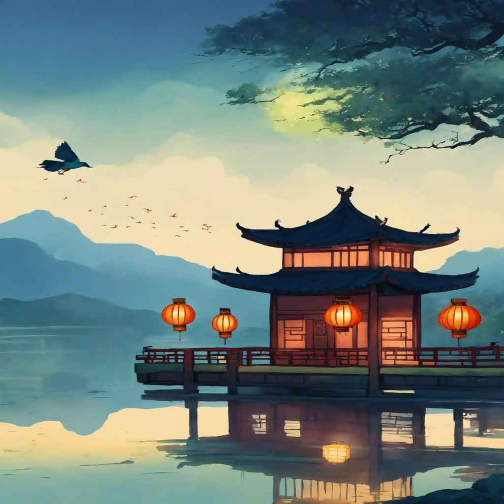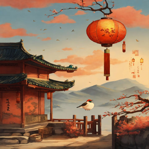 In this traditional Chinese painting, the scene unfolds in an open outdoor space under a vast sky. A lone bird soars gracefully through the air, its wings spread wide as it navigates the expanse of drifting clouds. Below, a delicate lantern, glowing softly in the fading light, hangs from a slender post, casting a warm glow amidst the fading day. The landscape is serene yet evocative, with a sense of timelessness and solitude, as though the wayfinding system that once guided travelers no longer works, leaving only the natural world to guide the way. Fresh brushstrokes capture the essence of the scene with a sense of calm and delicate simplicity.