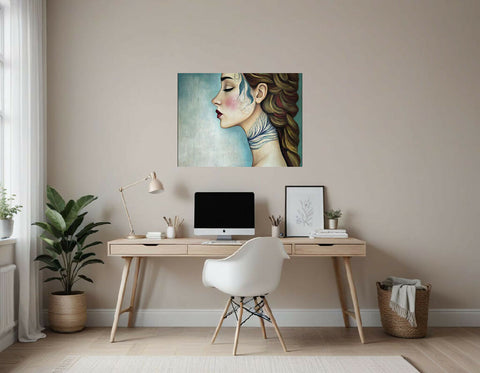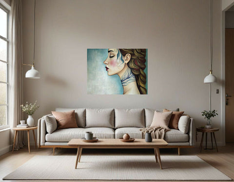 The illustration shows a profile view of a woman with her ear and a portion of her neck and shoulder visible. Her hair is styled in thick, wavy sections, primarily brown with subtle highlights, and is pulled back into a braid. The neck features an elegant, flowing design resembling delicate feathers or fine vines in shades of deep blue, suggesting either a tattoo or body art. The background is softly textured in blue and white hues, giving the artwork an ethereal, calm feel.