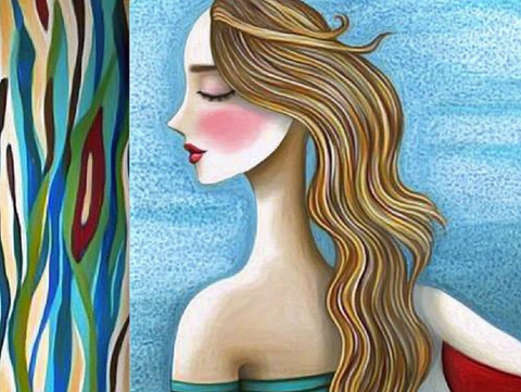 This painting features a stylized, abstract depiction of a woman seen from the back and slightly to the side. Her long, flowing hair is rendered in harmonious waves of gold, brown, and caramel, and it cascades elegantly down her back. She wears a strapless dress in shades of teal and red, highlighting her exposed shoulders and upper back.