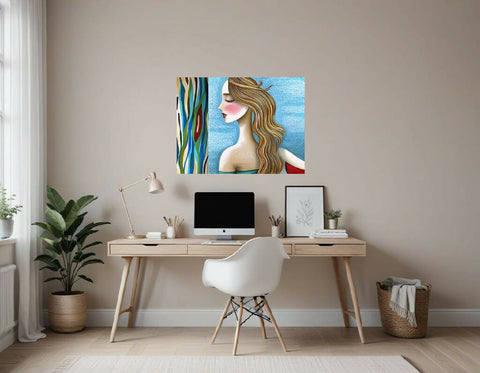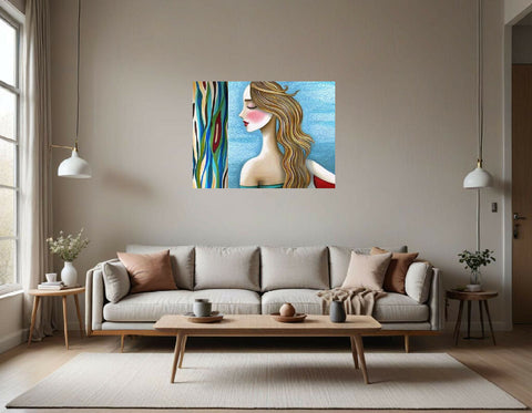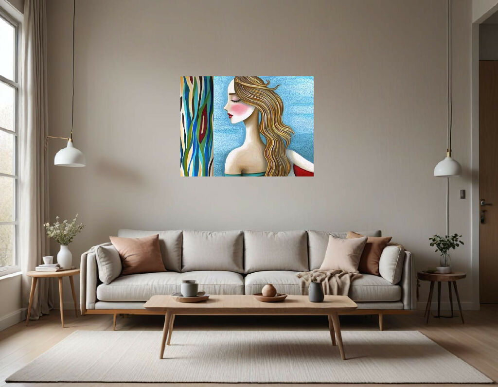 The background is divided into two distinct sections. On the right, there's a textured, light blue area that creates a soothing, sky-like effect. On the left, a bold, vertical pattern features organic, undulating shapes in blue, green, brown, red, and cream. These patterns provide a vibrant contrast to the softer, more subdued tones of the figure and evoke the feel of abstract nature or stained glass. The overall composition blends elements of abstraction and stylization, resulting in a modern and visually engaging artwork.