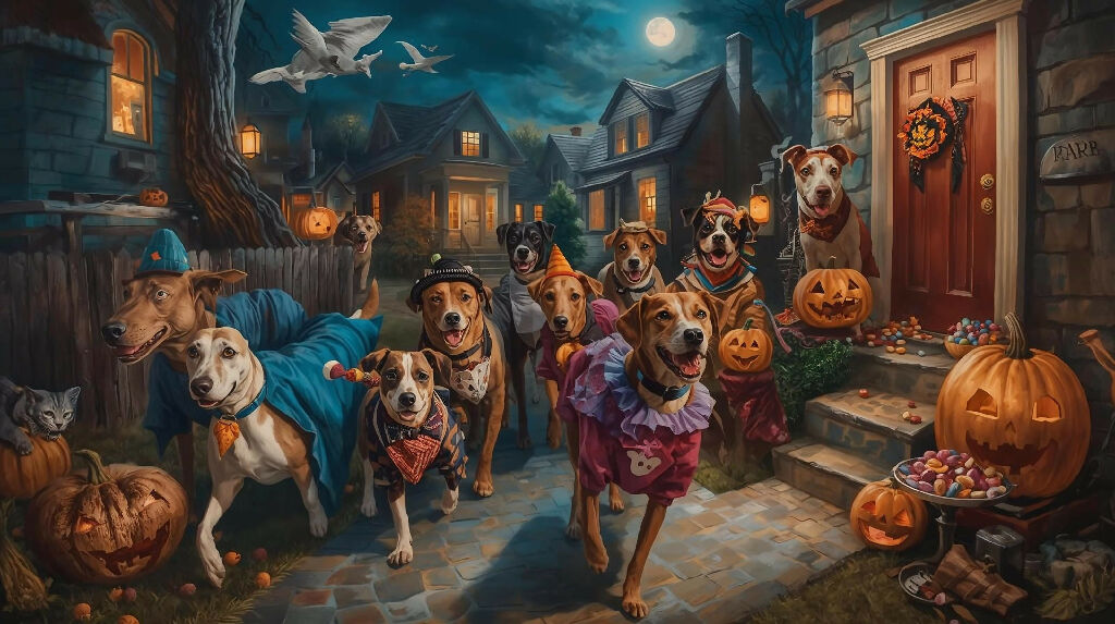 Whimsical painting of dogs trick or treating on Halloween night.