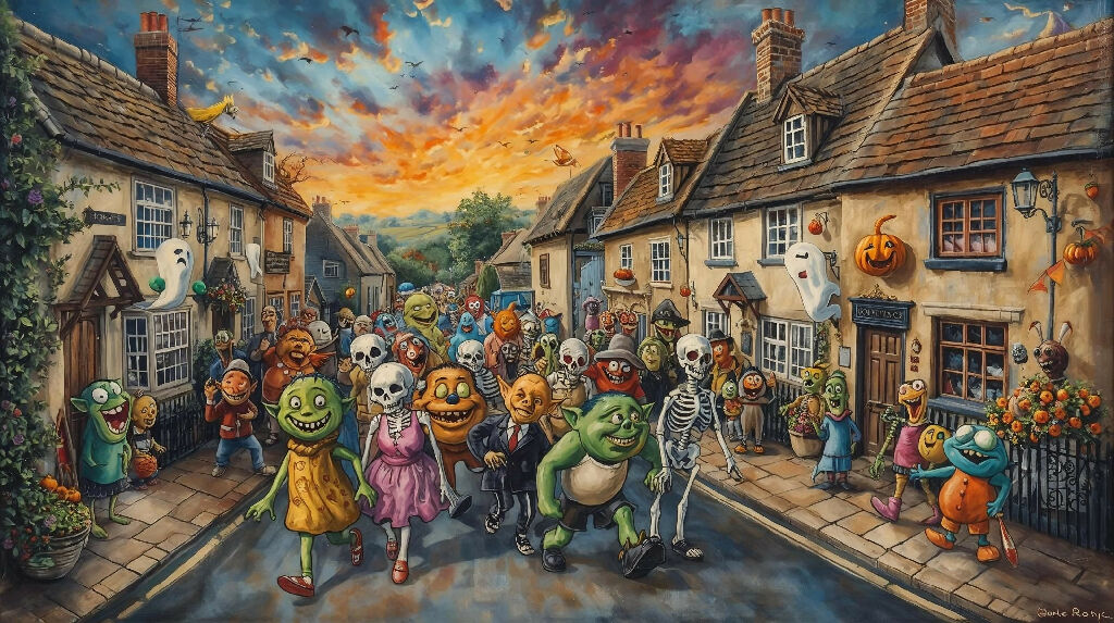 Surreal painting of a Halloween parade in a village in England consisting of ghouls and goblins.