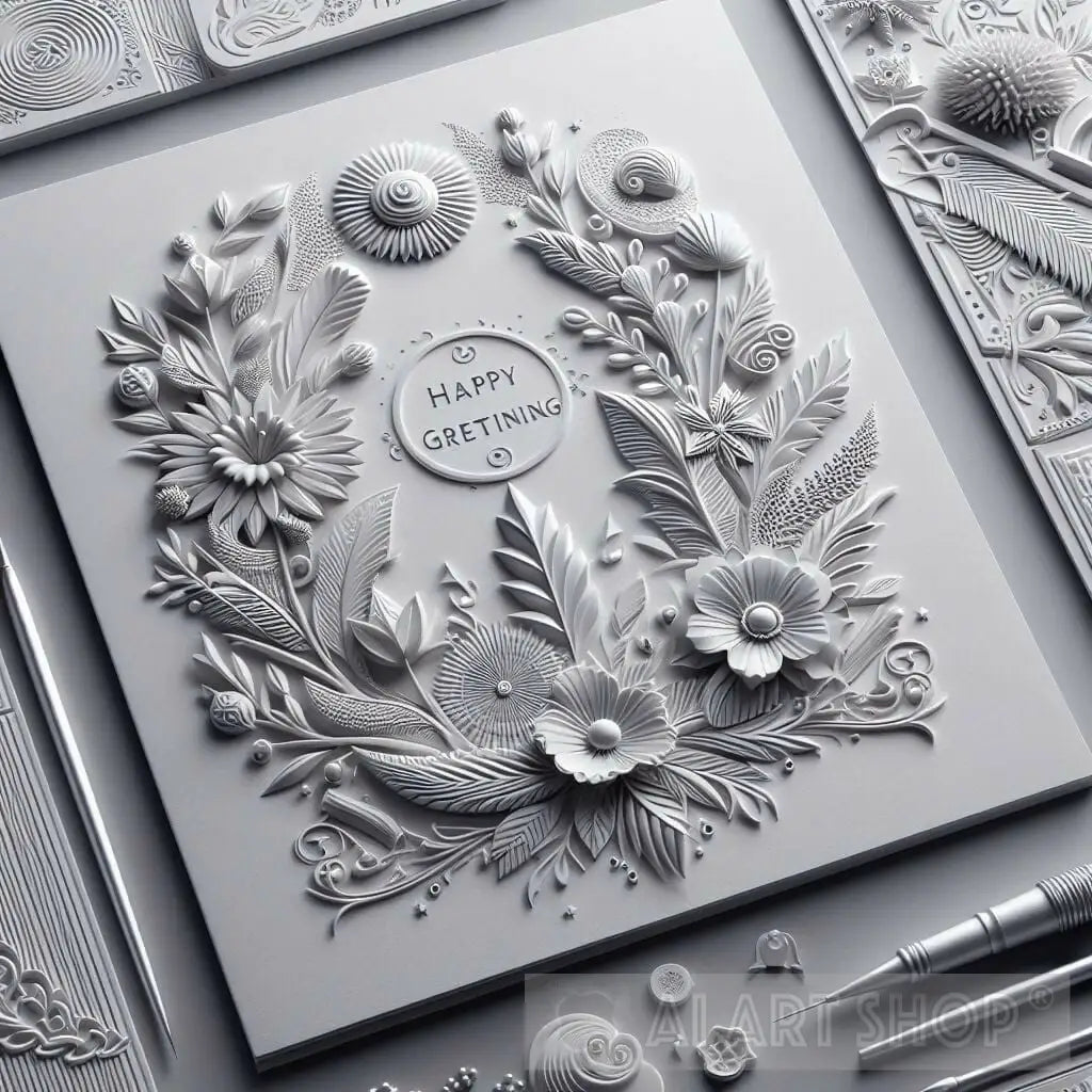 The image displays an artistic painting made in the style of 3D paper sculpture, showing floral and floral decorations in precise and harmonious details. The painting has a circle in the middle containing the phrase “HAPPY GRETINING.” The colors are all in shades of grey, which gives the work a unified and elegant character. Next to the painting are delicate tools used in the art of paper sculpture, which indicates the high craftsmanship required by this type of art