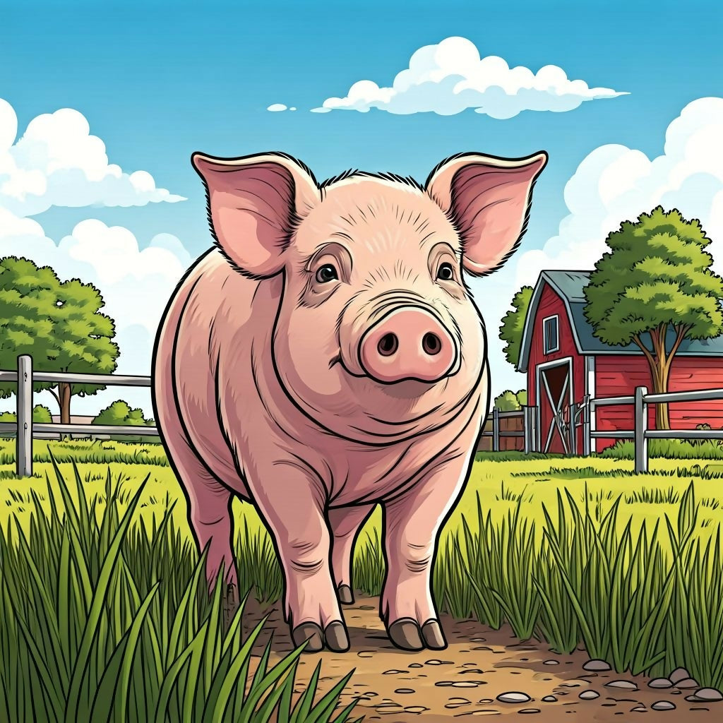 A cheerful pig stands on a sunlit farm path, surrounded by bright green trees, a classic red barn, and soft blue skies dotted with gentle clouds. The vibrant colours and friendly expression give the scene a warm, storybook charm, capturing the peaceful simplicity of rural life. This artwork blends playful character design with a cosy countryside atmosphere, making it a delightful piece for animal lovers and farm‑themed collections.