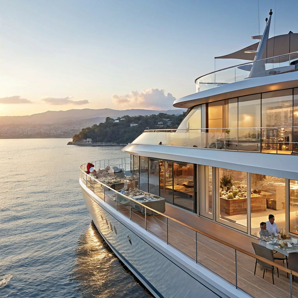 The yacht's deck features a spacious outdoor seating area, complete with a dining table and chairs, and a barbecue or outdoor kitchen station. Glass railings and modern furniture suggest a luxurious interior.