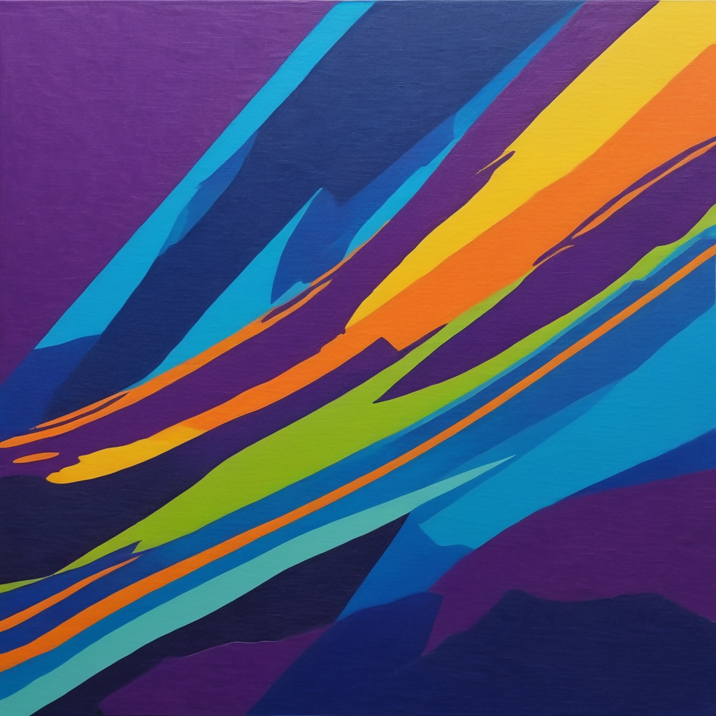 A symphony of electric blues, vibrant oranges, neon greens, and deep purples, this artwork pulses with dynamic energy. Flowing lines intertwine with bold splashes and geometric shapes, creating a sense of perpetual movement. Subtle gradients seamlessly transition between colors, while sharp contrasts and striking color blocks command attention. Layers of textures—from smooth gradients to rough patches and intricate patterns—add depth and intrigue, inviting exploration. This modern masterpiece captivates with its vibrant, harmonious interplay of colors, evoking a profound emotional resonance and a sense of endless discovery.