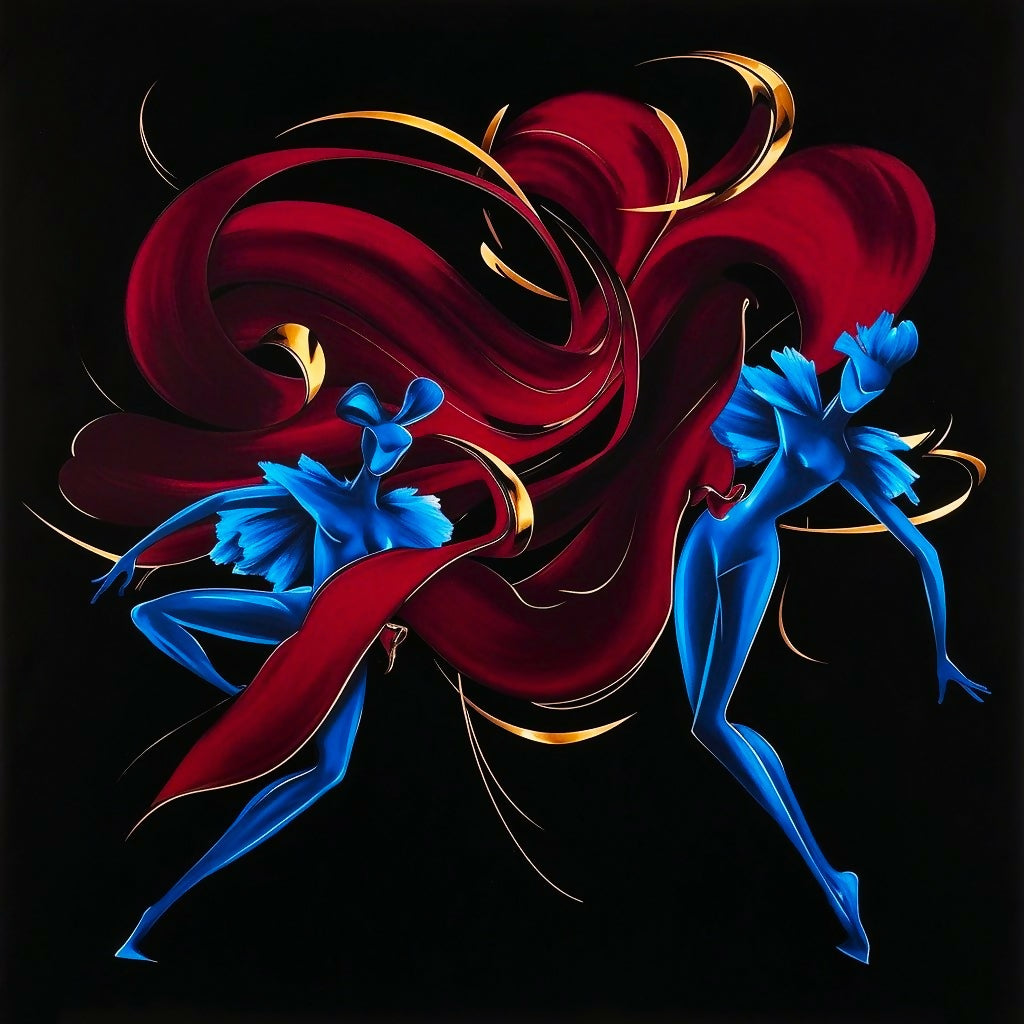An abstract composition featuring two fluid figures intertwined with flowing maroon ribbons and golden accents. The contrast of vibrant blues against a deep black background creates a striking sense of movement, making this piece a refined statement for modern interiors and artistic collections.