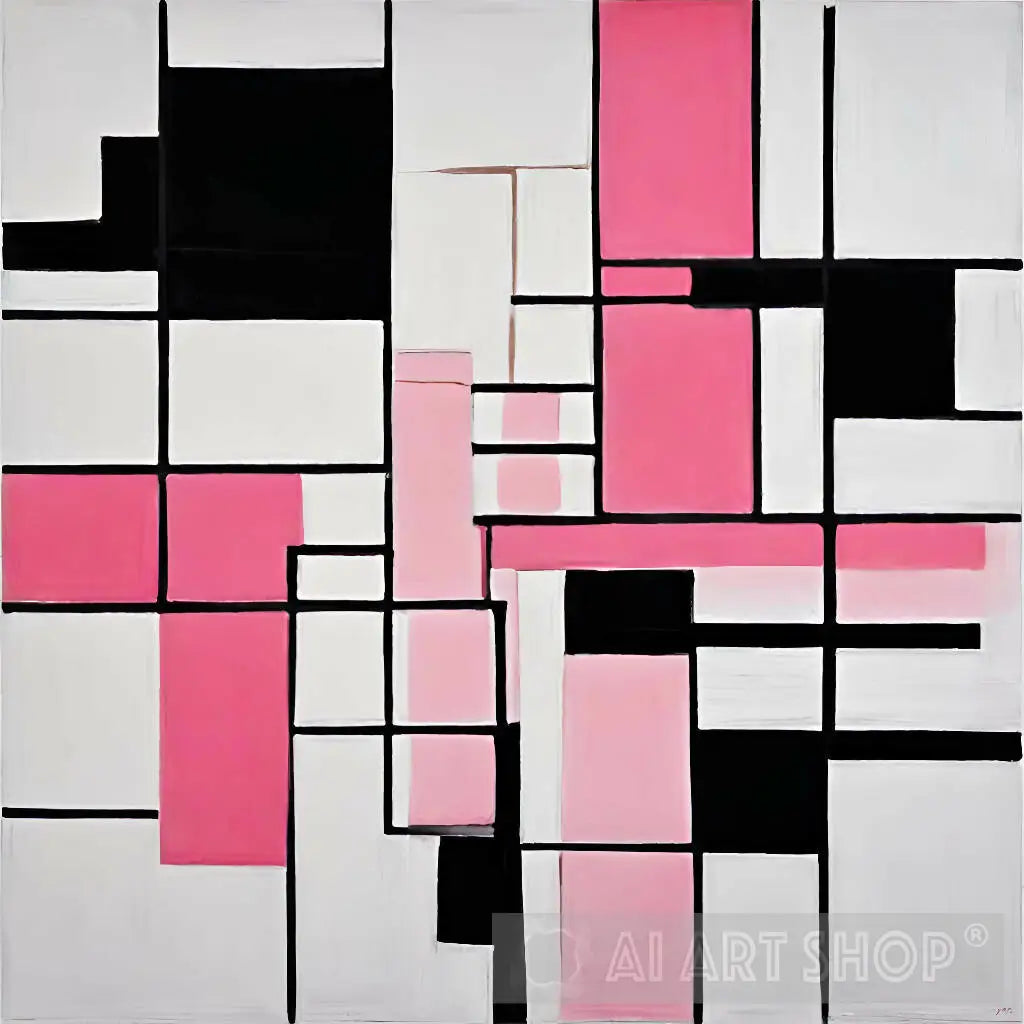 In the enchanting realm of AI-generated art, harmony in Pink Abstraction emerges as a striking ode to the iconic Mondriaan style, infused with a contemporary twist. This captivating painting seamlessly marries the geometric precision of Mondrian's grid-based compositions with a bold palette dominated by black, white, and the whimsical embrace of pink.
