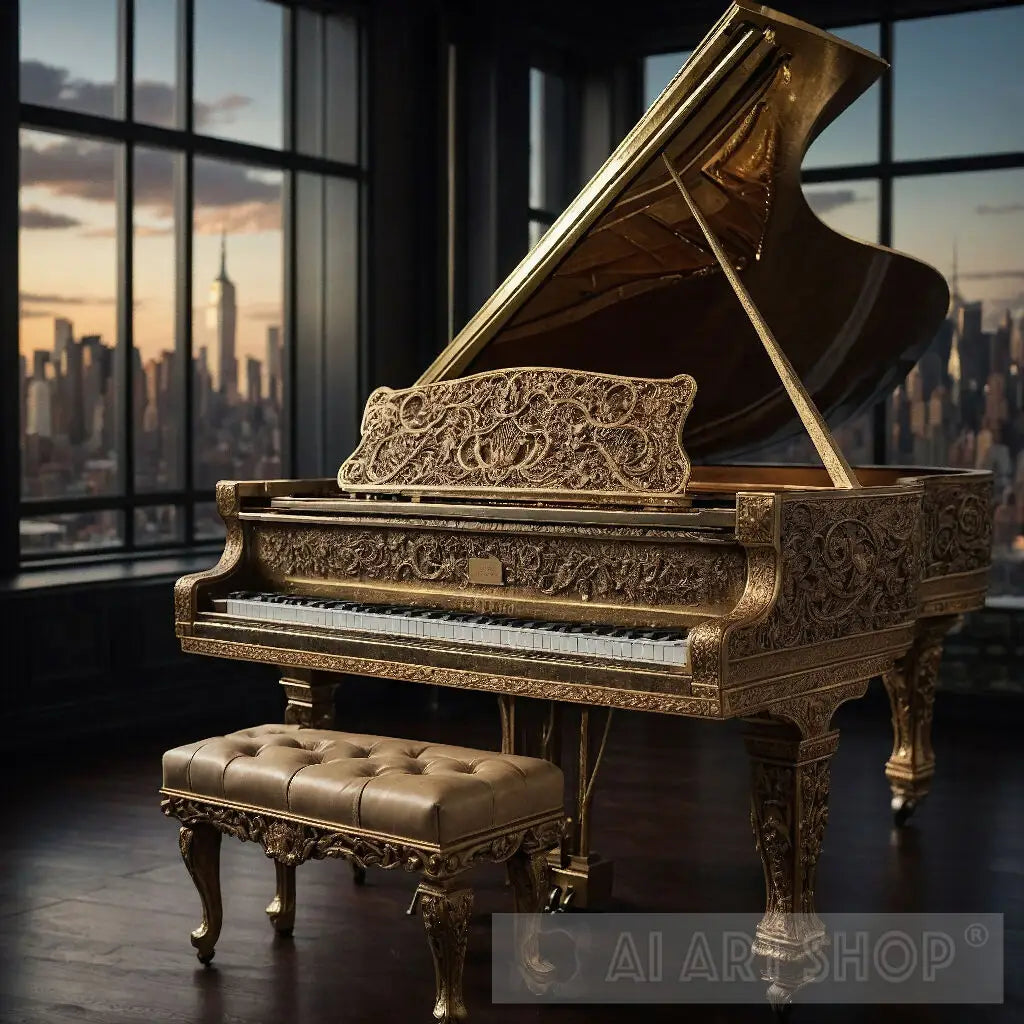 An exquisitely decorated grand piano and matching stool sit in a sunlit room with expansive windows overlooking the city skyline. The piano’s intricate carvings evoke luxury and elegance, while the modern urban view adds a captivating contrast.