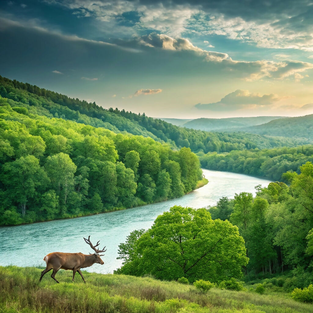 A serene landscape view. A winding river meanders through a lush valley flanked by dense, vibrant green forests.  The hillsides are covered in thickets of trees.  A reddish-brown deer with large antlers is visible walking across a grassy hilltop overlooking the river.  The sky is a mix of pale blue and light gray clouds, suggesting a late afternoon or early evening light. The overall impression is one of tranquility and natural beauty.