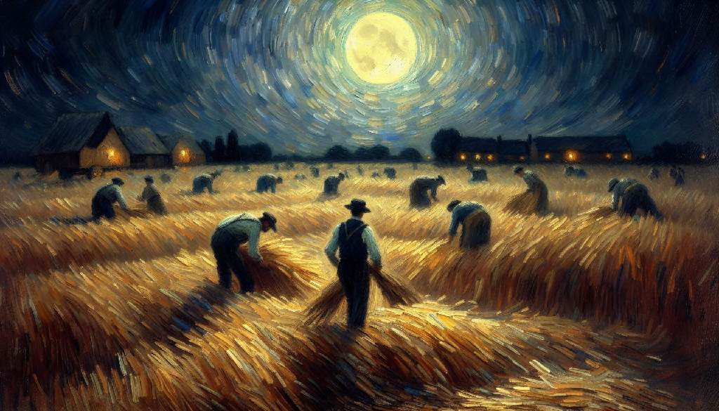 A warm, comfortable painting of moonlight harvest with tones of Van Gogh