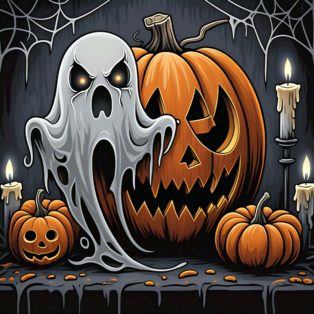 Step into the eerie glow of Haunted Harvest: Ectoplasm Rising, a chilling still life AI illustration that captures the haunted essence of Halloween night. At the heart of this artwork lies a sinister jack-o'-lantern, its jagged grin splitting the darkness as a ghostly figure oozes upward—part spirit, part spectral mist. Surrounding it, smaller pumpkins rest on a glossy, seed-scattered surface, while flickering candles and cobwebs whisper tales of forgotten rituals.