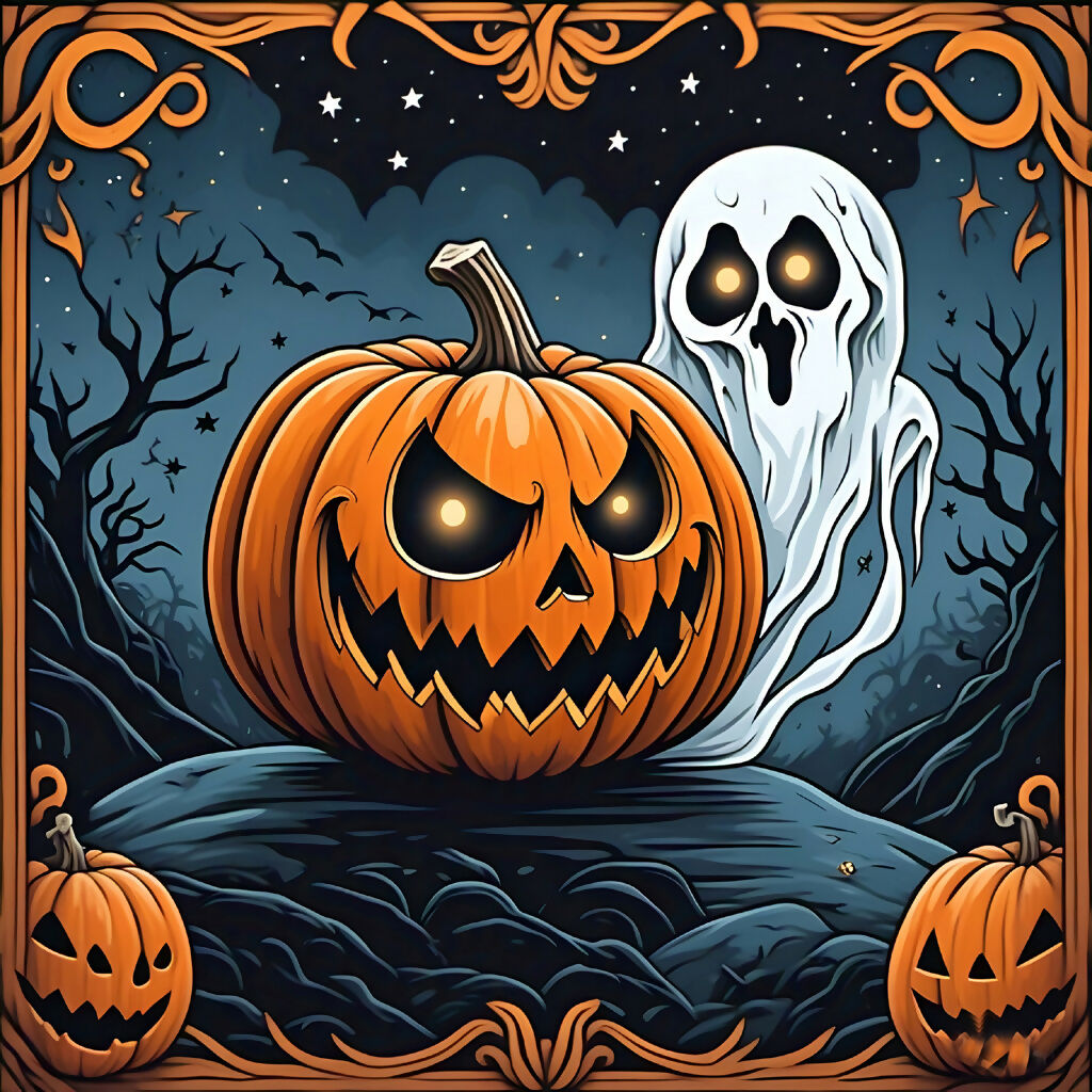 Step into the chilling world of Haunted Harvest, where the Lantern Lord rises once a year to guard the veil between the living and the spectral. This surreal AI-generated artwork captures the essence of Halloween with a towering jack-o'-lantern overlord, glowing with menace, flanked by ghostly apparitions and twisted trees under a star-speckled sky. The ornate orange frame adds a vintage Gothic touch, making this piece perfect for seasonal decor, spooky merchandise, or collectors of dark fantasy art. Whether you're decorating for October or curating a surreal art gallery, this haunting scene will mesmerize viewers with its eerie charm and cinematic depth.