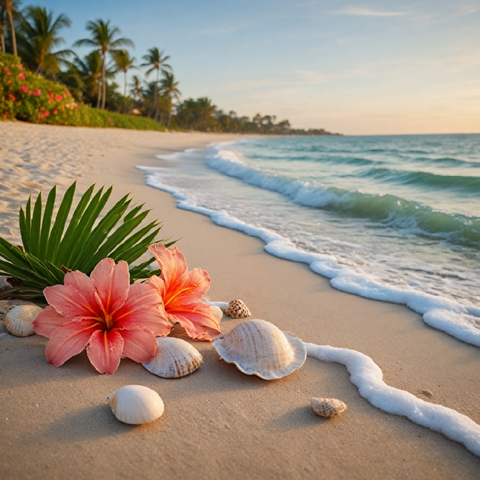 This serene tropical beach scene captures the soft glow of sunrise, with gentle waves washing up on creamy sands. Vibrant pink hibiscus flowers and seashells adorn the foreground, while lush palm trees stand in the distance, evoking a tranquil paradise. Perfect for adding a touch of coastal beauty to any space.