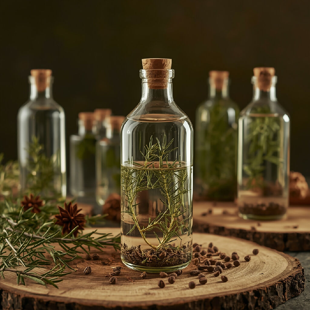 Hazme una foto de un rociador de plástico transparente con una mezcla de ajo picado y agua clara