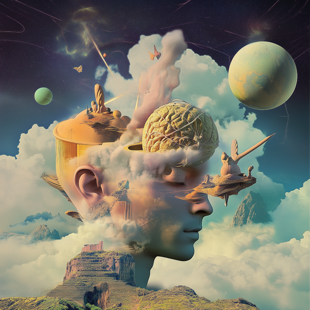 A mind adrift among planets. This AI-generated masterpiece blends surrealist imagery with science fiction dreamscapes. A quiet figure floats through clouds of thought, while castles, neurons, and galaxies orbit the imagination. It's consciousness untethered.