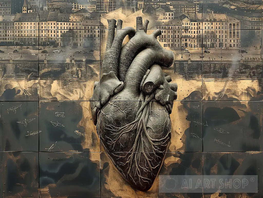A strikingly detailed, grayscale image of a human heart overlays a cityscape, creating a visual fusion of anatomical and architectural elements. The heart, meticulously rendered, is set against a background featuring classic urban architecture and a busy street scene, all with a somewhat faded and aged appearance. Below, silhouetted figures and objects cast in dark tones add to the image’s depth and complexity, suggesting layers of meaning and connection between humanity and the structures we inhabit.