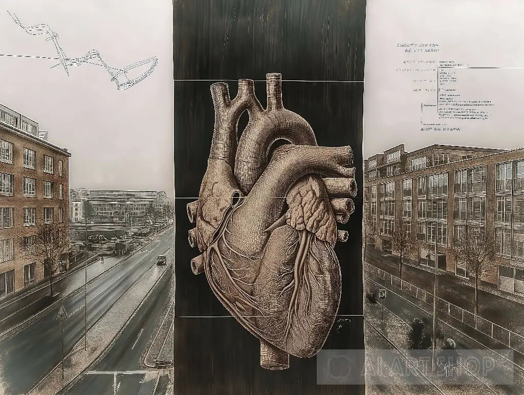 A highly detailed anatomical heart is the focal point of this image, set against a triptych of urban scenes, creating a stark juxtaposition. To the left, a sketch of a paper plane adds a whimsical touch, while to the right, text annotations hover beside a clear sky, possibly offering commentary or scientific data. The central panel's darker wood grain background accentuates the heart's textures, suggesting depth and vitality amidst the everyday city life depicted in the surrounding panels.