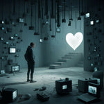 Dive into a world where technology and emotion intersect with "Heart of Connections." This captivating artwork features a lone figure standing in a room filled with vintage televisions and various electronic devices, all leading towards a luminous heart-shaped doorway. The muted blue tones and ethereal light create a surreal, contemplative atmosphere that speaks to the power of human connection in a digital age. Perfect for sparking conversations and adding a touch of modern intrigue to any space.