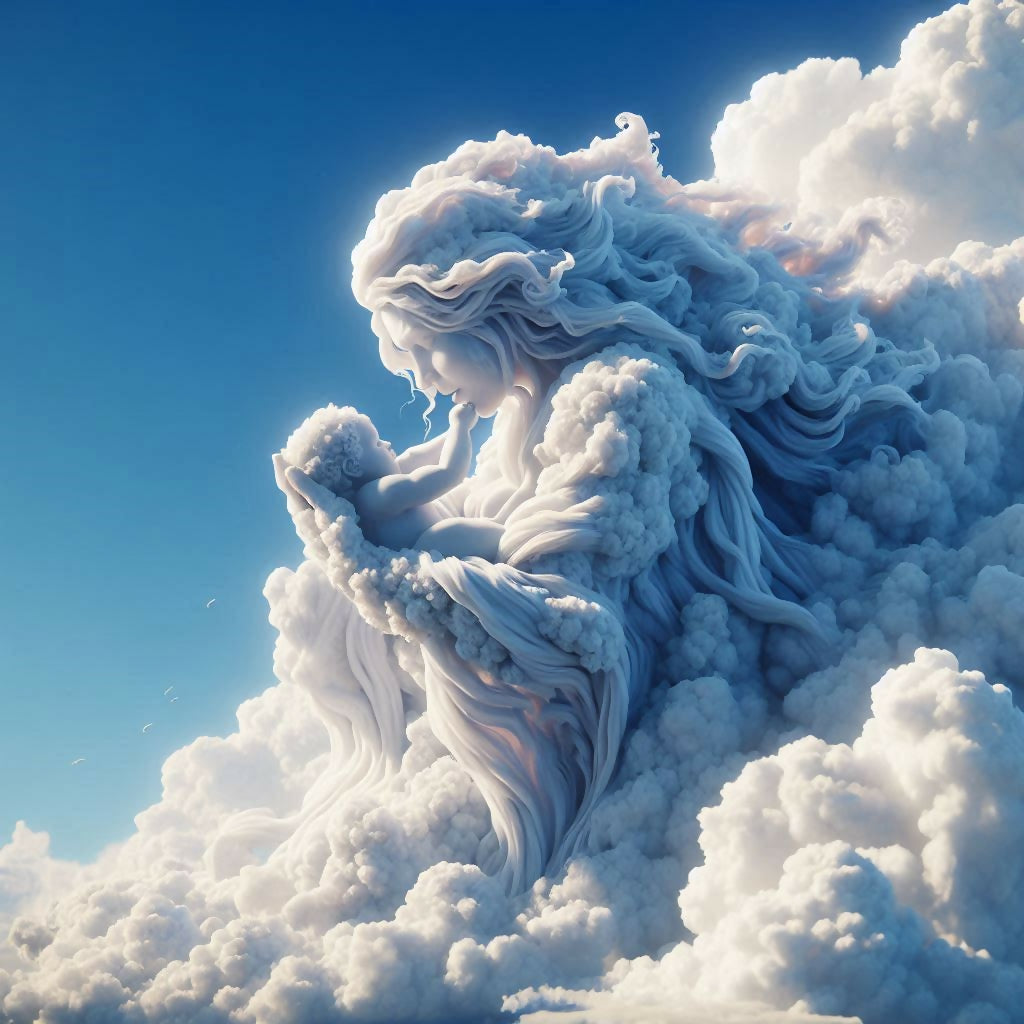 Epic Fan art of cloud in shape of mom in viel hugging a baby, exotic realism, divine, promosing pose, cinematic, detailed character portrait, epic, rtx on, daz3d, illusionary paintings, detailed and intricate environment, layered and complex compositions, realistic, unreal engine  --niji 5. The cloud should be fluffy and white, resembling a heart in a very distinct and recognizable way. The sky around the cloud is a bright and vivid blue, giving a serene and peaceful backdrop to the uniquely shaped cloud. The sun should be shining, casting a soft glow on the cloud, enhancing its heart shape