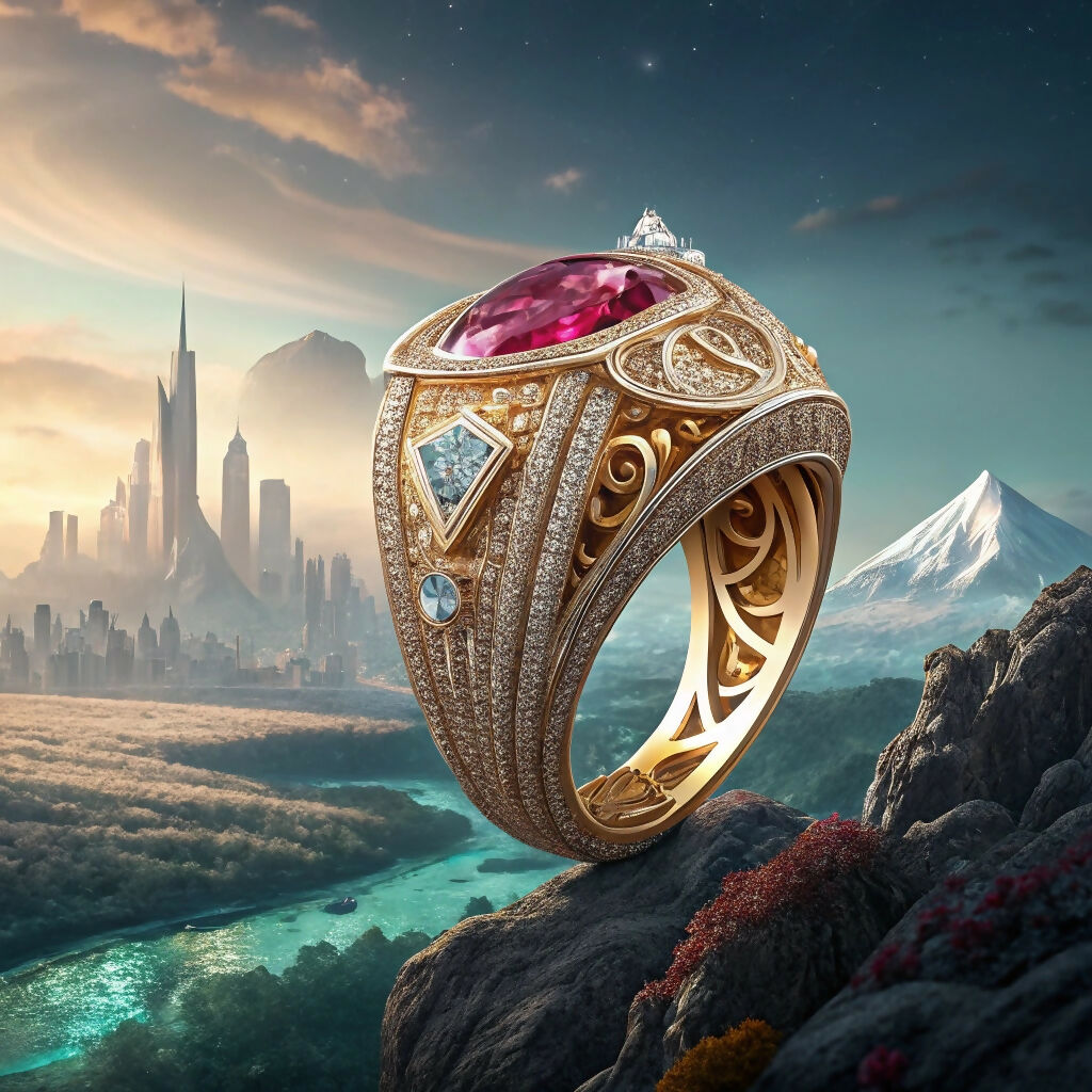 The image features a gold ring adorned with a large gem, set against the backdrop of a mountain landscape. The sky is visible, filled with clouds, highlighting the beauty of the outdoor setting. This scene combines elements of nature and fashion accessory in an artistic way.