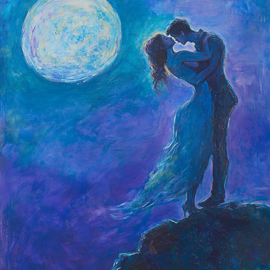 Above the world and below the stars, two souls find each other in a moment of floating stillness. This surreal AI artwork captures love at its most luminous—anchored in emotion, yet light as air. Painted in turquoise, violet, and silver moonlight, it feels like a wish made visible.
