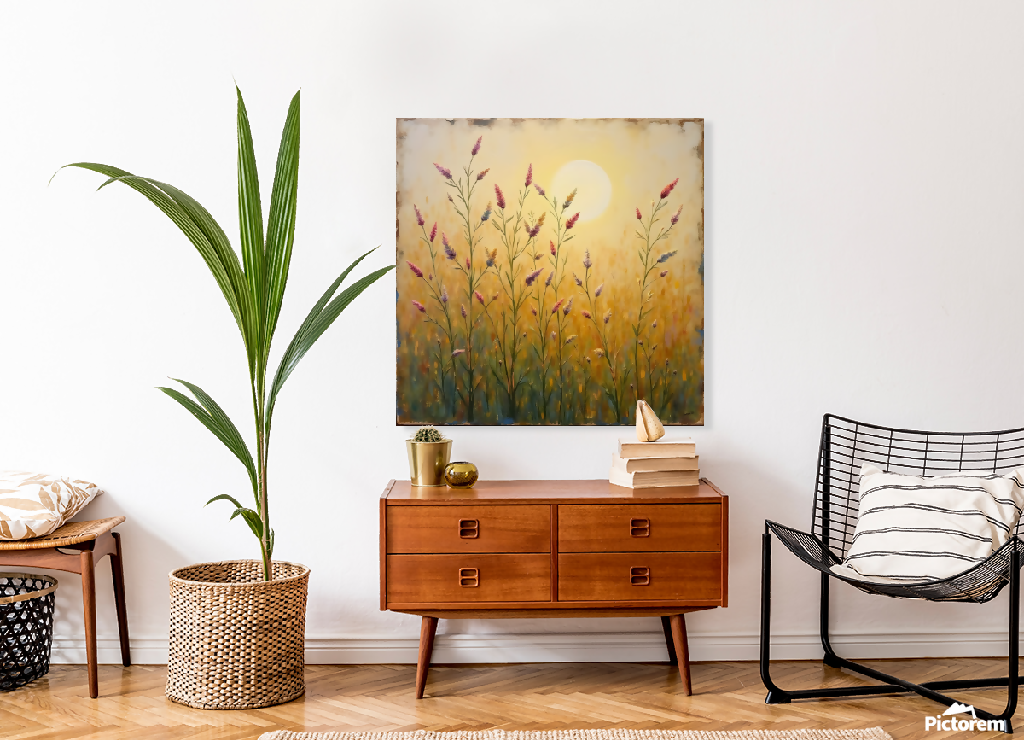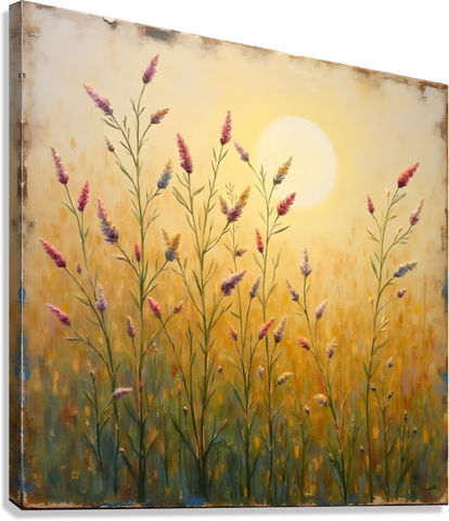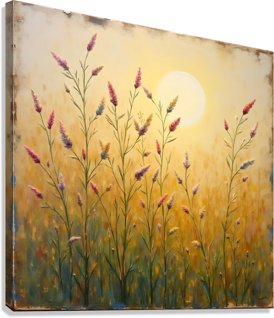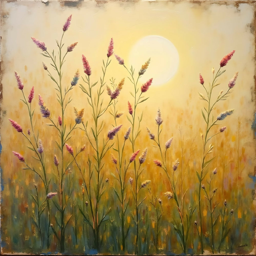 This impressionist oil painting depicts a vibrant herbs field set against a distressed, vintage background with subtle tears and creases. The soft brushstrokes and feathery textures evoke a sense of worn, tactile charm reminiscent of dreamy landscapes.