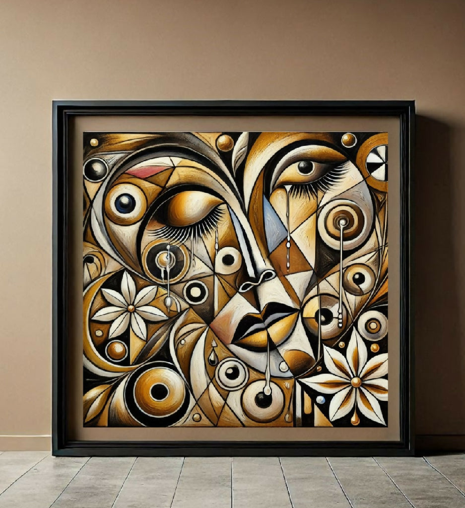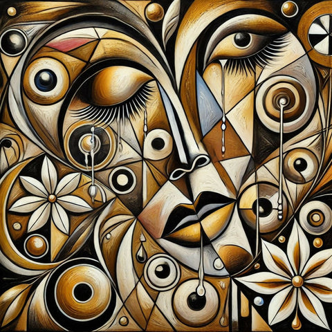 Ein abstraktes Bild in warmen Gold- und Brauntönen, mit einem Gesicht in Herzform. Aus den Augen des Gesichts fließen Tränen. Das Bild enthält geometrische Muster, Kreise, Ringe und Blumen.