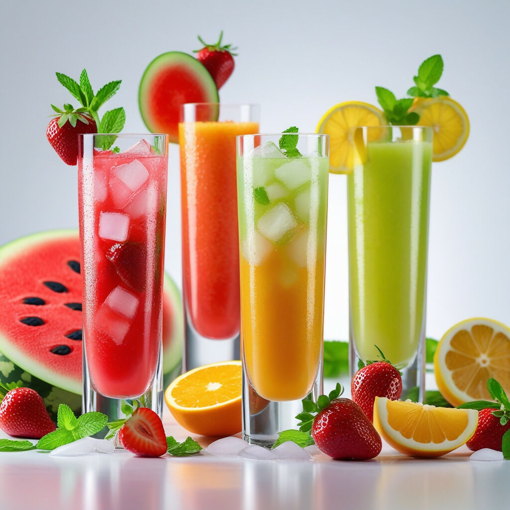 "High-definition, ultra-realistic food photography of fresh fruit juices in modern tall transparent glasses with ice cubes. Show three to four glasses filled with colorful juices: watermelon juice (bright red), strawberry juice (vibrant pink), orange juice (fresh orange), and lemon-mint juice (light yellow-green). Place the juices together with a clean, modern look. Surround the glasses with fresh fruits — sliced watermelon, whole and cut strawberries, juicy orange slices, lemon wedges, and fresh mint leaves. Background should be bright and minimal (plain white or soft gradient) to make the colors pop. The overall look should be refreshing, modern, and appetizing, perfect for a menu card."