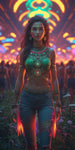 (High quality art by Cholos.) create a series of spiritual and festive psychedelic images for prints on shirts, blouses and other clothing items intended for electronic raves and festivals. The prints should combine spiritual and mystical elements with a sense of electrical energy and euphoria. beatifull tribal spirit renaissance goodness woman posing like a professional model, teleported to a green synthwave cyberpunk dimension, matrix code surreal labyrinth, klimbr style,autenticity, gratitude, magic atmosphere, darkness, fantastic background,film photography, analog photography, film grain, extreme detail, 4k, ultra hd, hyperrealism, trending on artstation, polished, beautiful, radiant, synesthesia, vibrant, photorealistic, backlight, hair light, 8k ultra hd, unreal engine 5rp, and the expression fierce octane render character concept, cinematic, full character trending on artstation, perfect eyes and face. perfect legs, awesome full color, Onlookers are visible, and the player's sun-kissed skin peeks through her athletic wear. The overall color palette should include psychedelic color. intricate artwork masterpiece, epic, Deep lines, heavy strokes. Intense dramatic lighting captures a dynamic scene.