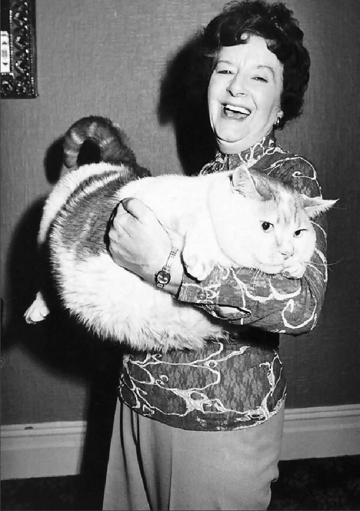 This charming 1977 black-and-white photograph captures a moment of pure joy and affection between Hilda John and her extraordinary six-year-old cat, Thomas O'Malley. The beaming Hilda, dressed in a patterned dress, cradles her massive tabby in her arms—his enormous fluffy body spilling over, tail curling dramatically, eyes calmly fixed on the camera. Weighing an astonishing 19 kilograms (42 pounds), Thomas O'Malley was one of Britain's heaviest house cats at the time, yet his gentle demeanor and Hilda's proud, laughing expression tell a story of deep companionship rather than mere novelty. The cozy interior setting, with framed pictures on the wall behind them, adds warmth and intimacy to this endearing portrait of oversized feline love and unwavering devotion. A delightful slice of 1970s pet history, full of humor, tenderness, and record-breaking charm.