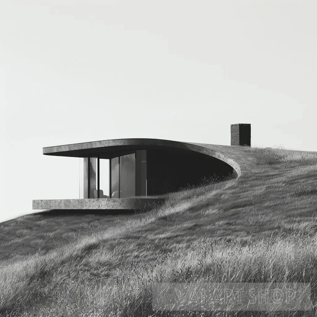 The building's curved roofline follows the natural contours of the land, creating a harmonious blend with its surroundings. The extensive glass facade allows for panoramic views, connecting the interior spaces with the serene, rolling landscape outside.